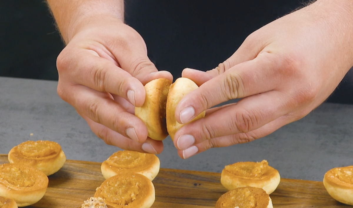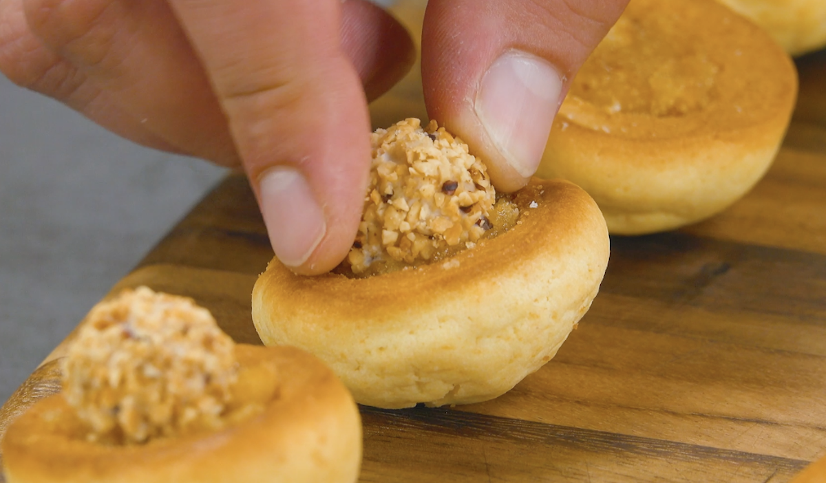 4. Verrühre diese Krümel mit Pfirsichkonfitüre und fülle die ausgehöhlten Kekse mit dieser Mischung wieder auf.