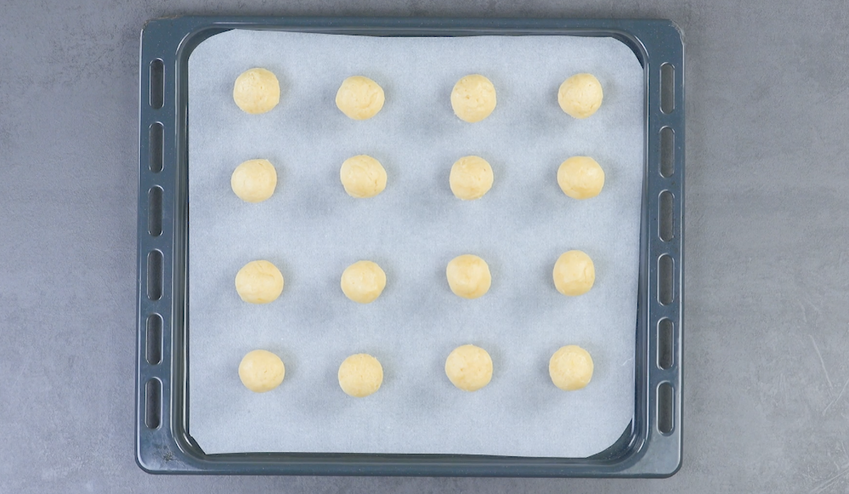 2. Forme nun aus dem Teig ca. 25 g schwere Kugeln und lege sie auf ein mit Backpapier ausgelegtes Backblech. Backe die Kugeln im vorgeheizten Ofen für ca. 15 Minuten bei 180 °C Ober- und Unterhitze. Hole das Blech dann heraus und lasse die Kekse zunächst abkühlen.