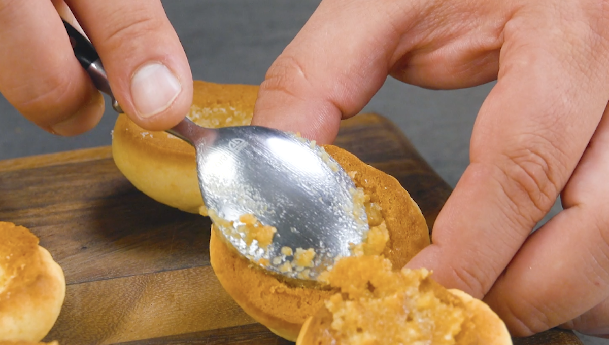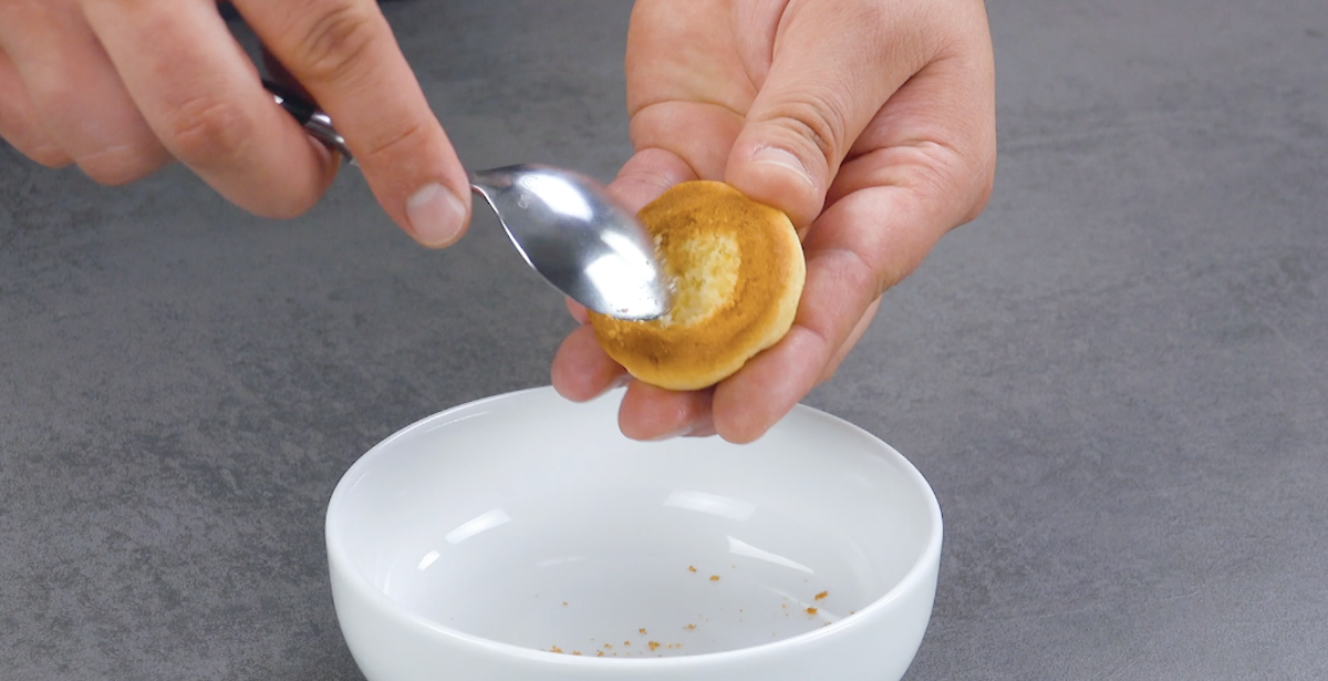 3. Höhle die Kekse mithilfe eines Löffels auf der Unterseite etwas aus. Die Kekskrümel sammelst du in einer Schüssel.