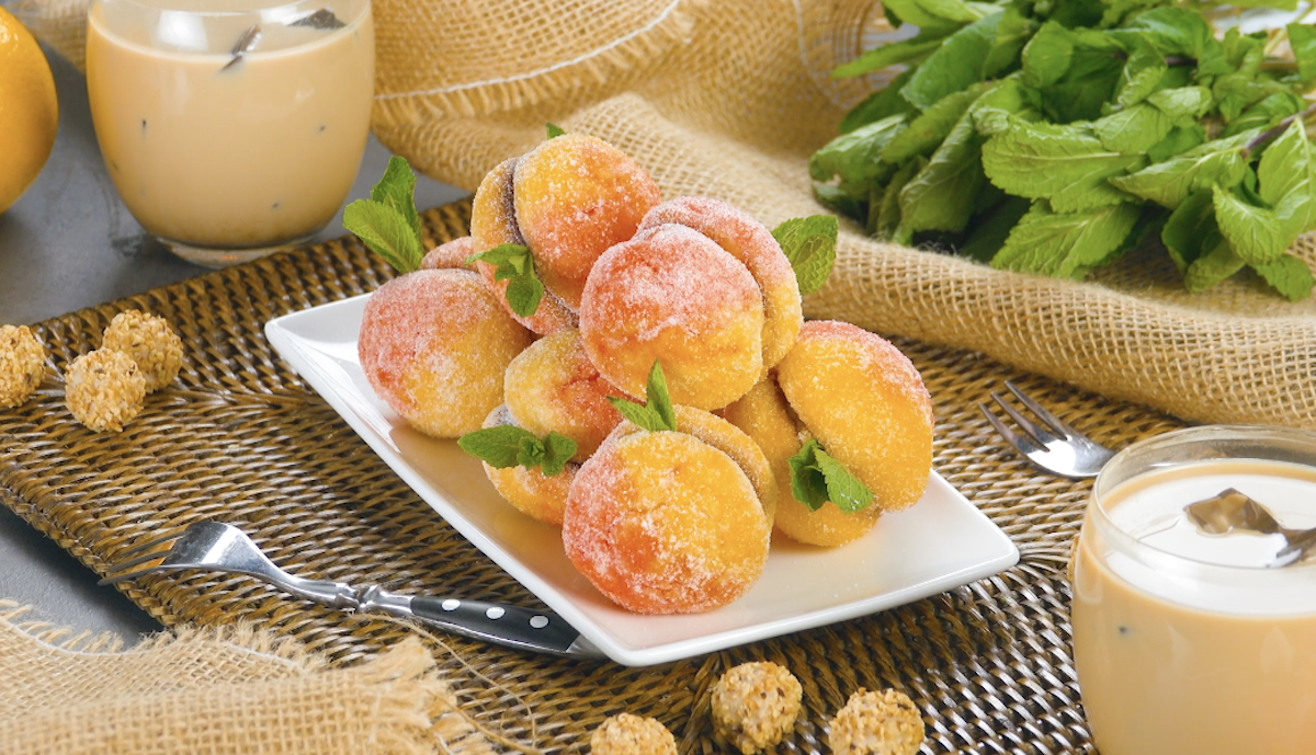 7. Wälze die Kekse dann vorsichtig in einer Schale mit Zucker. Zum Schluss steckst du frische Minze in den Spalt im Keks, sodass er aussieht wie ein Pfirsich.