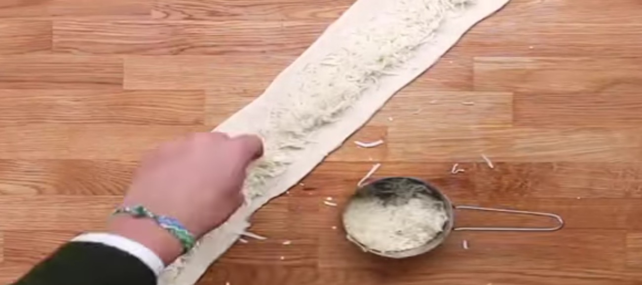 Jetzt rolle den Streifen Pizzateig vorsichtig zusammen, sodass du eine lange Rolle hast, die mit leckerem Käse gefüllt ist. Alle Lücken und Fugen werden sorgsam zugedrückt.