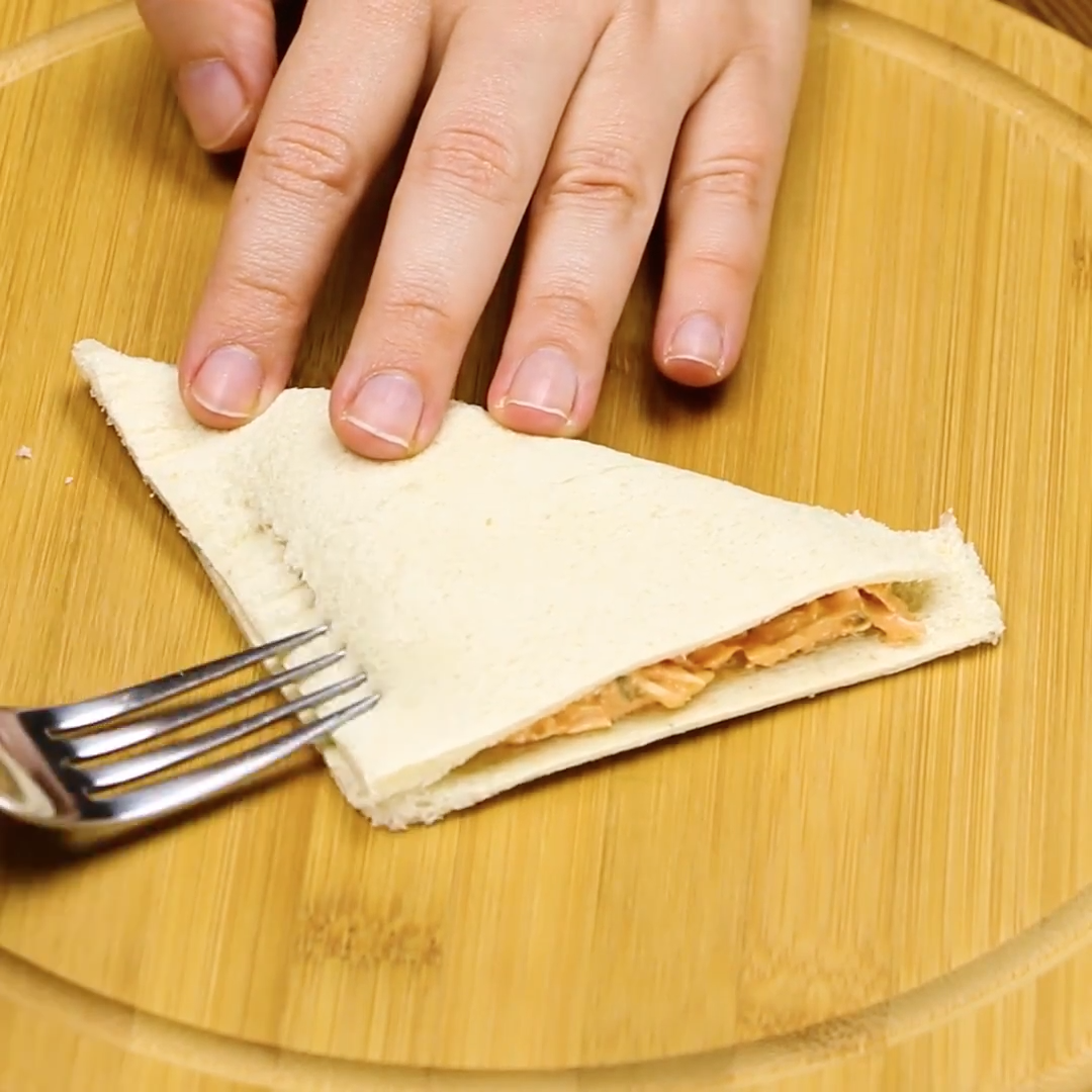 3.) Dann die Füllung auf die plattierten Toastbrotscheiben geben. Pro Tasche brauchst du etwa einen Esslöffel der Masse.