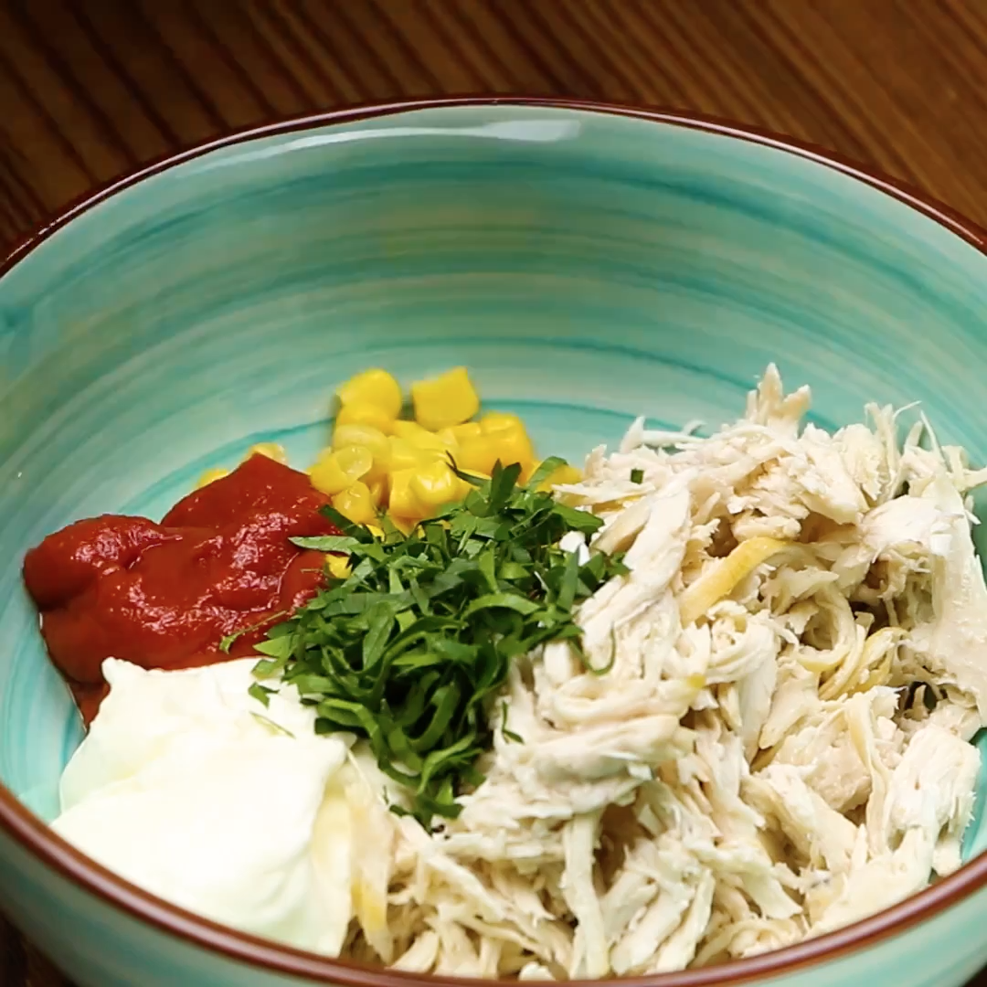 1.) Zupfe die Hähnchenbrust klein und mische sie mit Mais, Tomatenmark, Frischkäse, Oregano, Petersilie, Salz und Pfeffer.