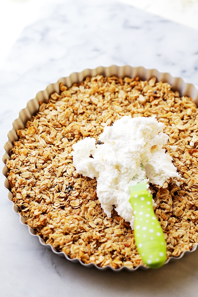 Drücke die Mischung fest in eine gefettete Quicheform. Backe den Müsliboden bei 190 °C für zehn Minuten.