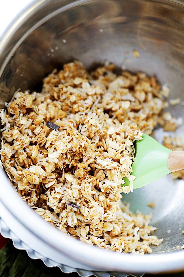 Mische erst die trockenen Zutaten für den Boden, dann gib den Honig oder den Sirup hinzu, und vermische alles zu einer einheitliche Masse.