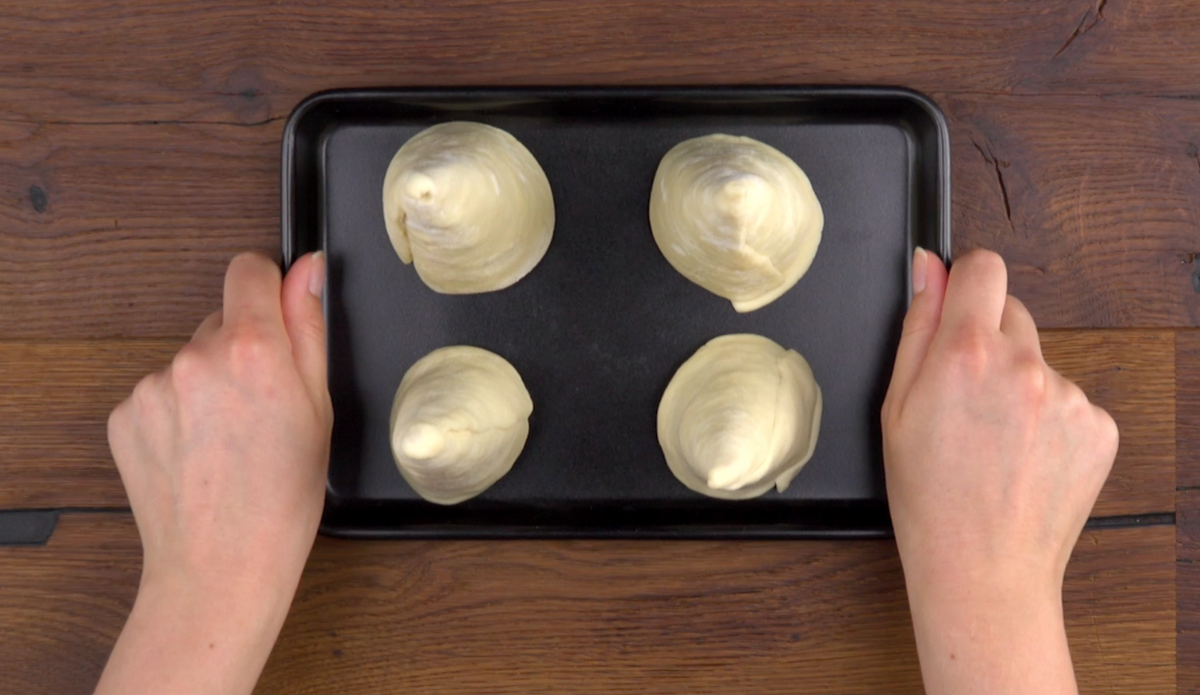 2.) Schneide den Pizzateig über Kreuz in vier identisch große Portionen. In jedes der Stücke rollst du einen Papierkegel ein.