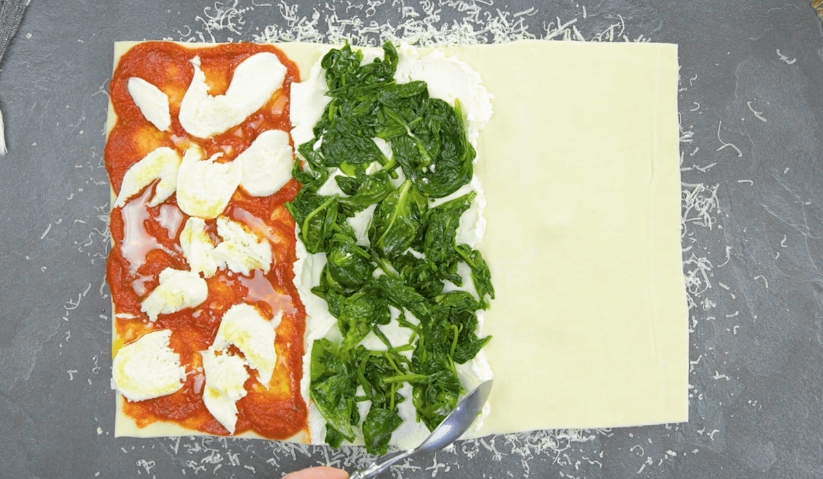 2. Streiche das zweite Drittel des Teiges mit Ricotta ein. Sautiere Spinat in Butter und verteile ihn dann auf dem Ricotta. Reibe noch Muskatnuss auf den Spinat.