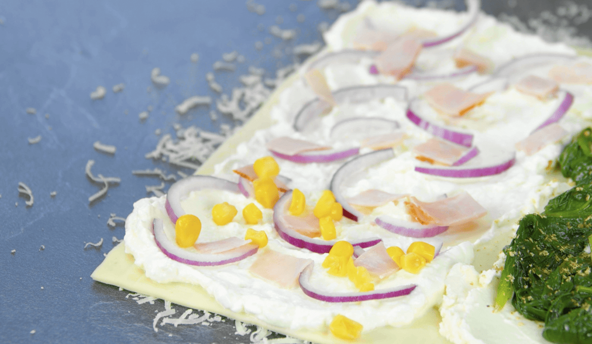 3. Streiche Frischkäse auf den Rest des Teiges und verteile darauf Zwiebeln, Kochschinken und Mais.