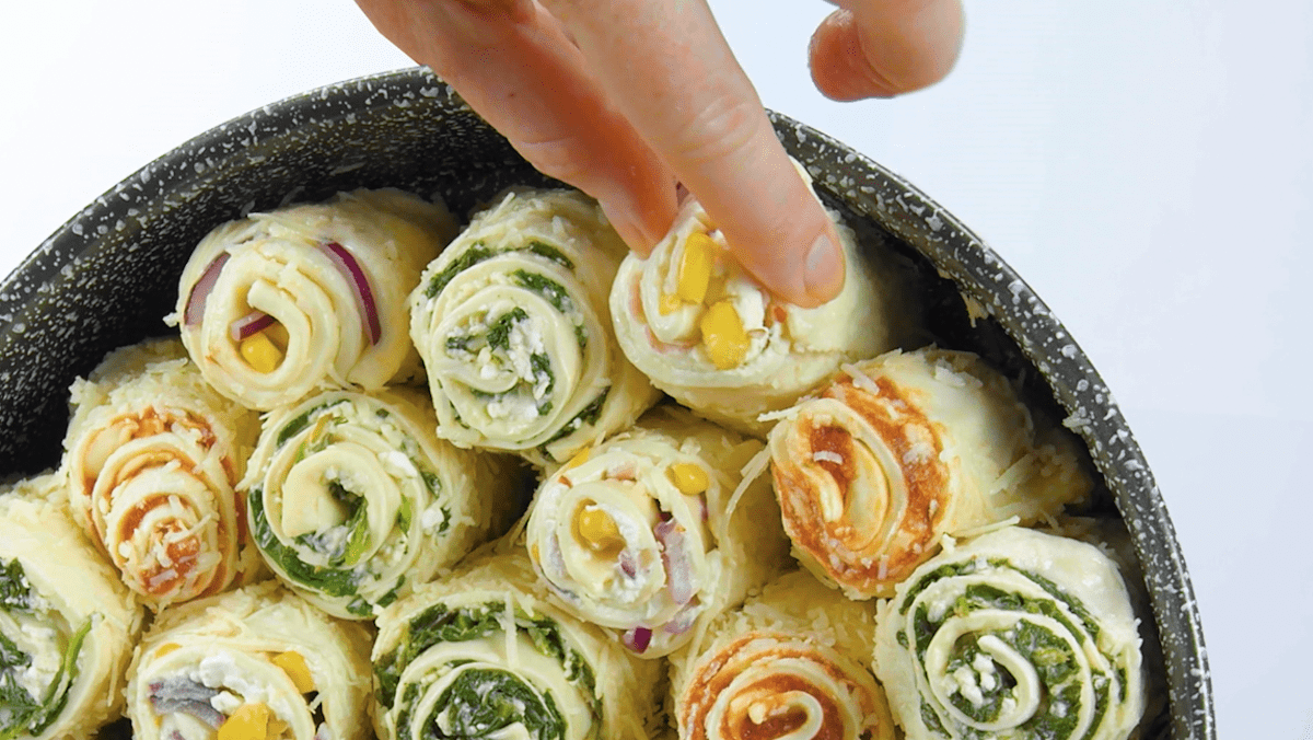 Dieser Pizzaröllchen-Kuchen ist eine Wucht. Die einzelnen Röllchen sind schön handlich und jeder kann ein Exemplar seiner Wahl aus dem Kuchen herauslösen. Ideal für eine ganze Familie!