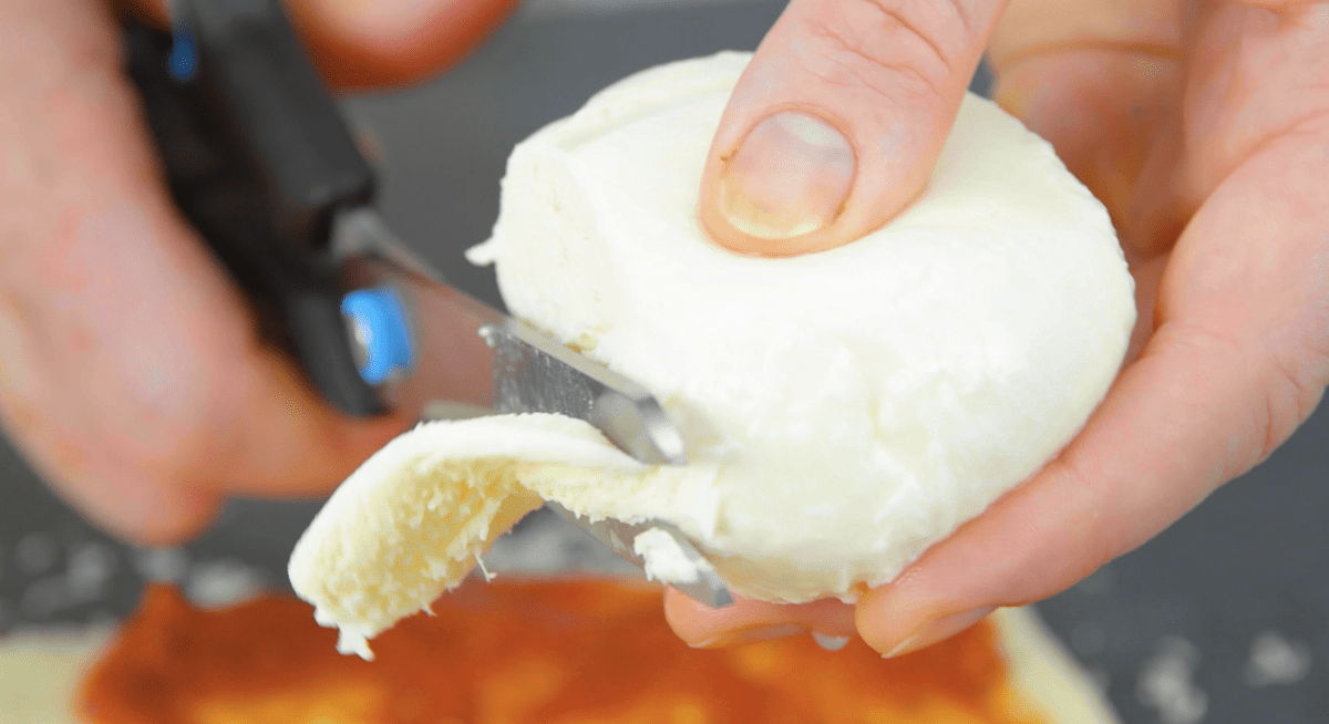 1. Streue den geriebenen Parmesan auf deine Arbeitsfläche und breite darauf den Pizzateig aus. Gib Oregano, Knoblauchpulver und Salz in die Dose mit den passierten Tomaten und vermenge alles miteinander. Gib die Tomaten auf etwa ein Drittel der Teigfläche und verteile darauf geschnittenen Mozzarella und Olivenöl.