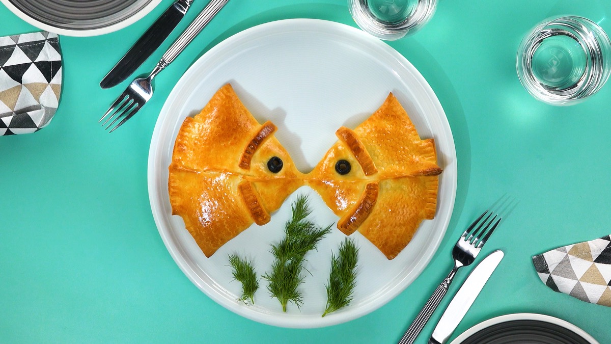 13. Halbiere eine schwarze Olive und benutze sie als Augen für die Fische. Bepinsele den kompletten Teig mit verquirltem Ei. Schiebe die Pizzateig-Taschen mit Räucherlachs auf einem Backblech bei 180 °C Umluft für 15 Minuten in den Ofen.