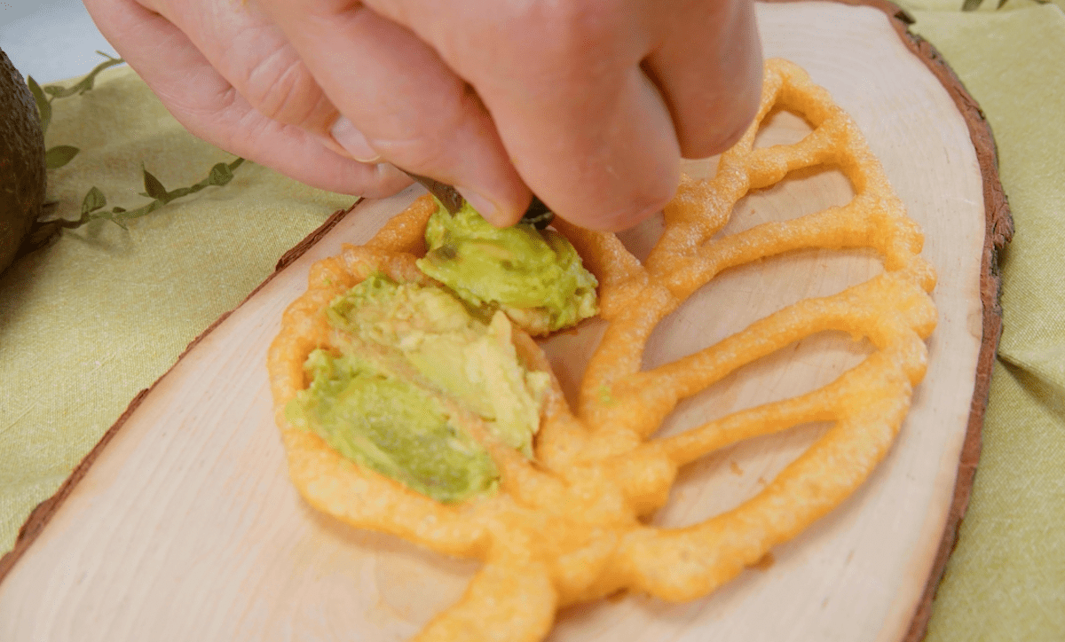 4. Presse dann die Fruchtmasse mit der Hand aus dem Inneren der Avocado durch das von der Spritze verursachte Loch in die leeren Bereiche des frittierten Blattes.