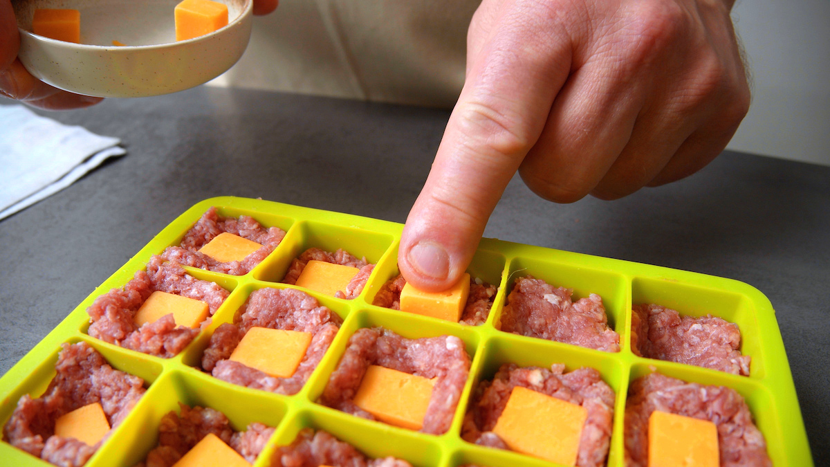 1. Vermische das Hackfleisch mit einem Ei sowie Semmelbröseln und würze es mit Salz und Pfeffer. Drücke etwa 3/4 der Masse in die Mulden des Eiswürfelbehälters. Drücke dann in jede Mulde noch ein Stück Cheddar und bedecke den Cheddar mit dem restlichen Hackfleisch. Stelle die Eiswürfelform anschließend für 2 Stunden ins Gefrierfach.