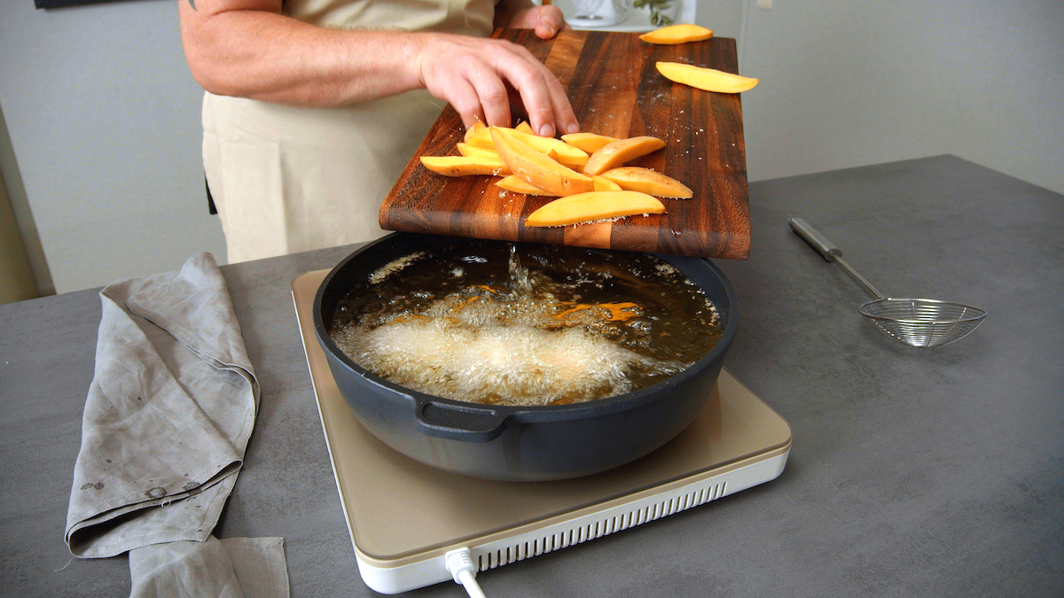 5. Frittiere die Kartoffelspalten und die Hackwürfel für 5 bis 8 Minuten bei 160 °C.