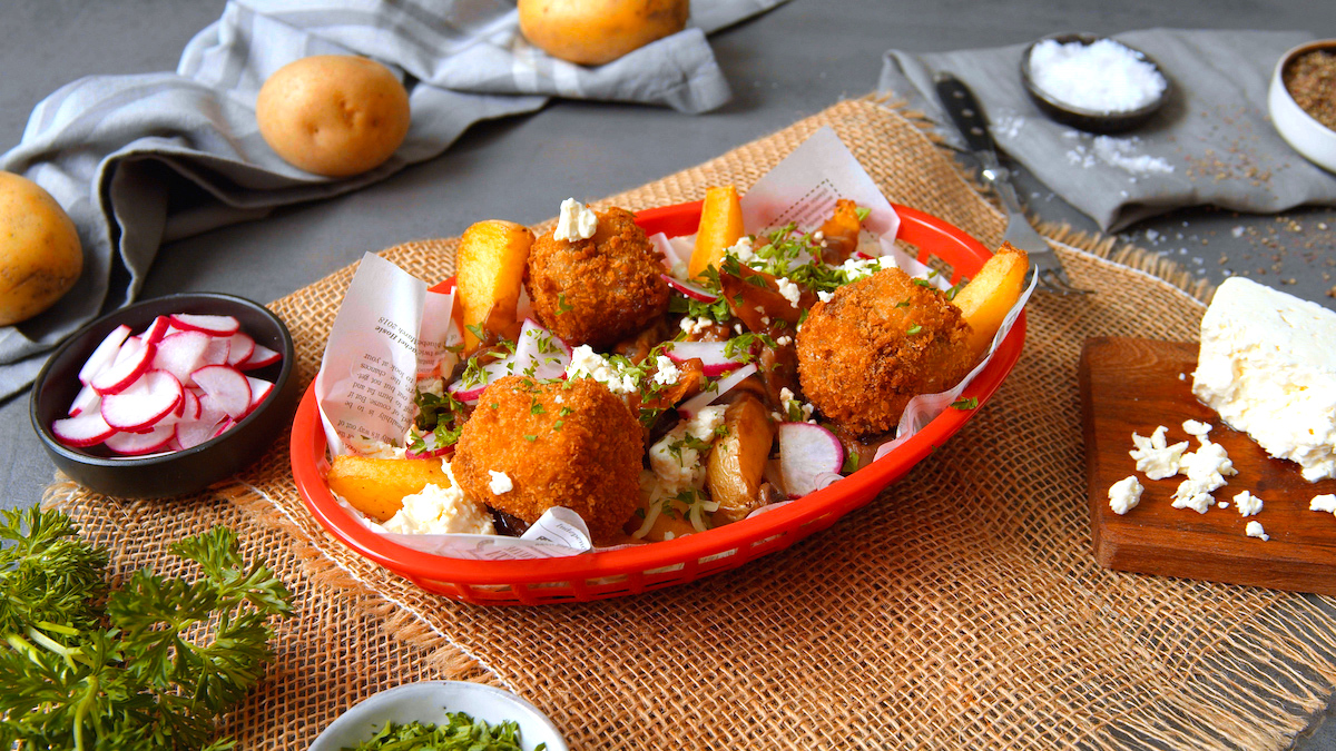 6. Bestreue vor dem Servieren die frittierten Kartoffelspalten zunächst mit Mozzarella, bedecke sie dann mit der Pilzsoße und drapiere die Hackwürfel darüber. Garniere das Ganze mit zerbröseltem Feta, Radieschenscheiben und Petersilie.