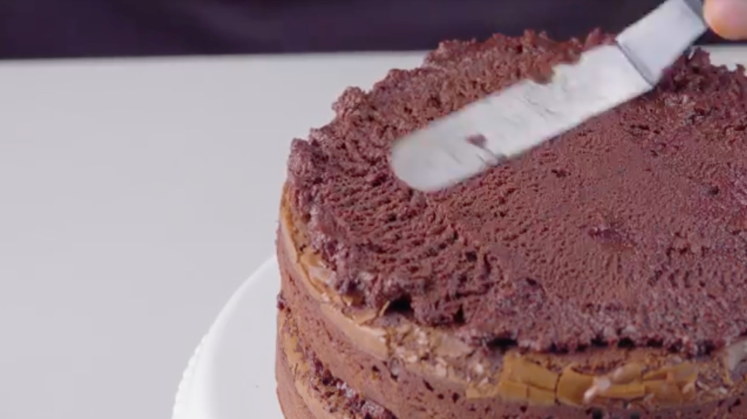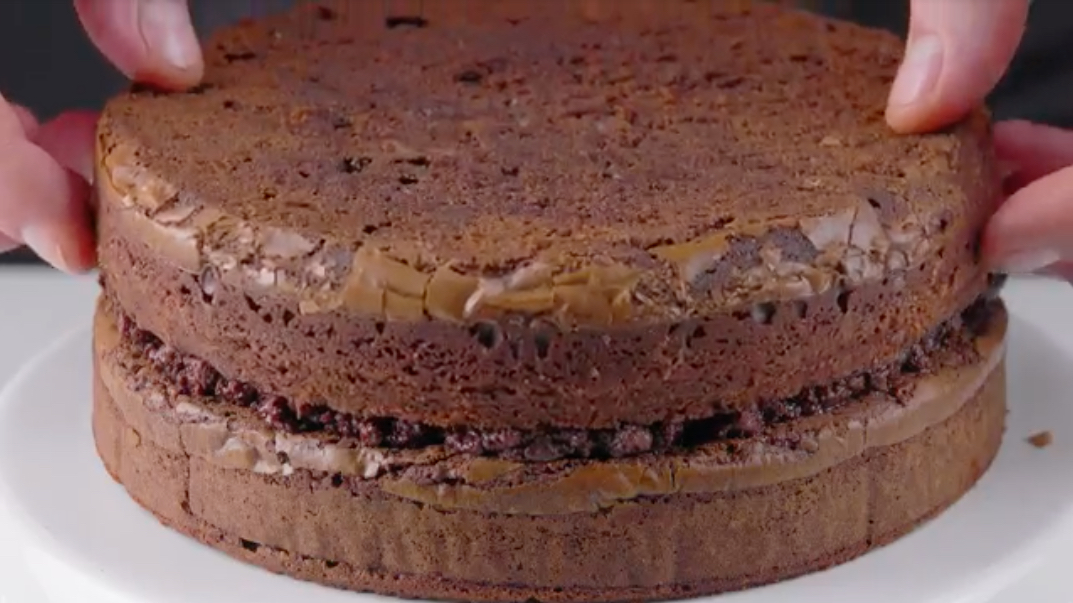 3.) Bestreiche immer eine Kuchenschicht mit der Pralinencreme, lege die nächste Schicht darauf und bestreiche auch diese, bis du einen leckeren Schichtkuchen gezaubert hast. Verquirle die Butter und das Brownie-Mix-Pulver zu einer Creme, mit der du das Äußere des Schichtkuchens einstreichst.