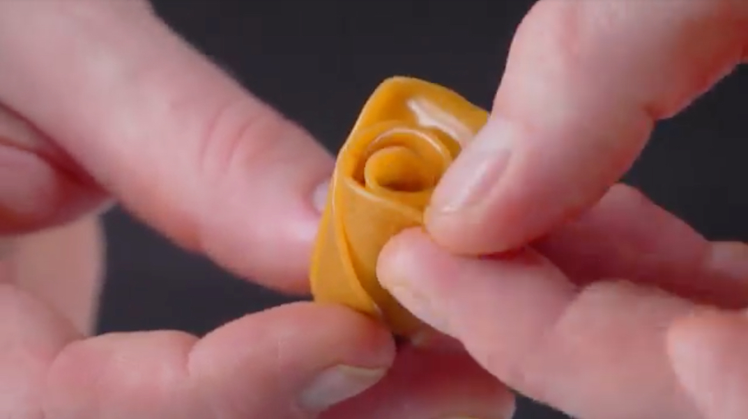 6.) Drehe die Kreise zu einem Röllchen und zupfe dieses zurecht, bis du eine Karamellblume hast. Forme so viele Karamellblumen, wie du nur willst.