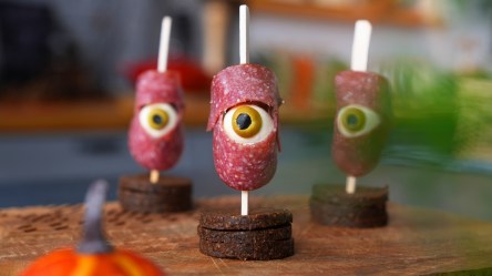 Verwende 2 Salami-Halbmonde, um sie so an den Spießen zu befestigen, dass nur noch das Auge zu sehen. Spieße sie danach auf das Brot.