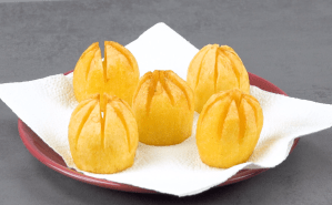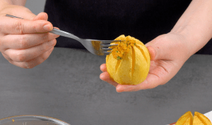 Befülle die Einschnitte der frittierten Kartoffeln unter Zuhilfenahme einer Gabel mit der pürierten Masse. Aus dem verbleibenden Rest der Masse formst du kleine Bällchen.
