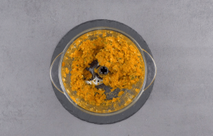 Schneide die Hähnchenbrust, Zwiebeln, Knoblauch und Petersilie grob klein und gib alles in einen Mixer. Füge dann Paprikapulver, Currypulver und Pfeffer hinzu und püriere alles fein.