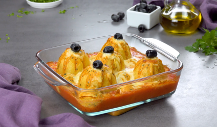 Gib die Tomatensoße in eine Auflaufform. Stelle nun die gefüllten, frittierten Kartoffeln hochkant in die Tomatensoße. Die Bällchen legst du ebenfalls in die Form und bestreust alles mit Käse. Lege auf jede Kartoffelspitze eine schwarze Olive. Schiebe die Auflaufform bei 175 °C Umluft für 25 Minuten in den Ofen.