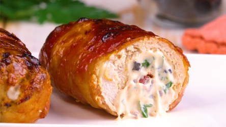 Jetzt legst du vier Bacon-Scheiben untereinander und rollst die Hähnchenbrust auch in diese ein.