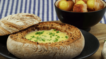 Schließe das Brot mit der anfangs abgeschnittenen Oberseite, dem „Deckel“, wickle es in Alufolie und backe es, mitsamt der Bacon-Kartoffeln auf einem separaten Blech, für 30 Minuten bei 180 °C im Ofen.