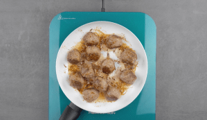Als Erstes bereitest du die Hackfleischbällchen zu. Gib dafür das Hackfleisch, Knoblauch, Kräuter, Toastbrot, Ei, Salz und Pfeffer in eine Schüssel und vermenge alles miteinander. Forme mit deinen Händen ca. 12 Hackfleischbällchen, die etwa die Größe eines Tischtennisballs haben, und brate diese in einer Pfanne an. Stelle die Hackfleischbällchen zunächst beiseite.