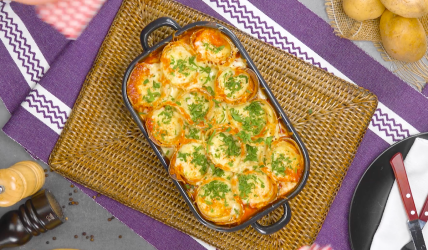 Verteile großzügig geriebenen Käse auf der ganzen Auflaufform und gib den Kartoffelauflauf anschließend bei 170 °C Umluft für 30 Minuten in den Ofen.