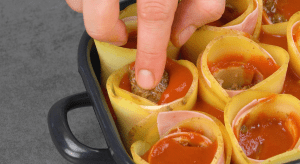 Stelle die 12 Röllchen hochkant in eine Auflaufform und gieße Tomatensoße in alle 12 „Löcher“.