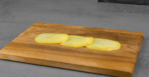 Lege nun immer 3 Scheiben Kartoffeln überlappend nebeneinander.