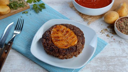 Brate nun den Kartoffel-Hack-Patty von beiden Seiten in einer Pfanne langsam an. Beginne dabei mit der Kartoffelseite.
