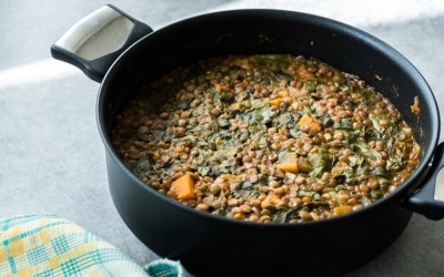 Wasche den Spinat und schleudere ihn danach trocken. Gib ihn zum Eintopf, sobald die Linsen gar sind.
