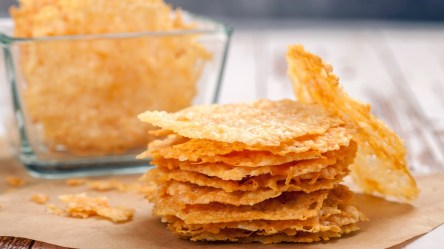 Nimm die Parmesan-Chips vorsichtig mit einem Spatel vom Backpapier.