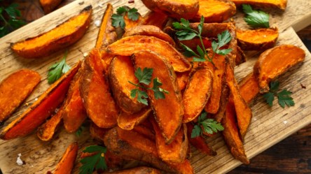 Schäle die Süßkartoffeln und schneide sie in Wedges. Schneide sie längs in dicke Streifen und teile diese dann in Hälften oder Drittel, je nach Größe der Süßkartoffel.