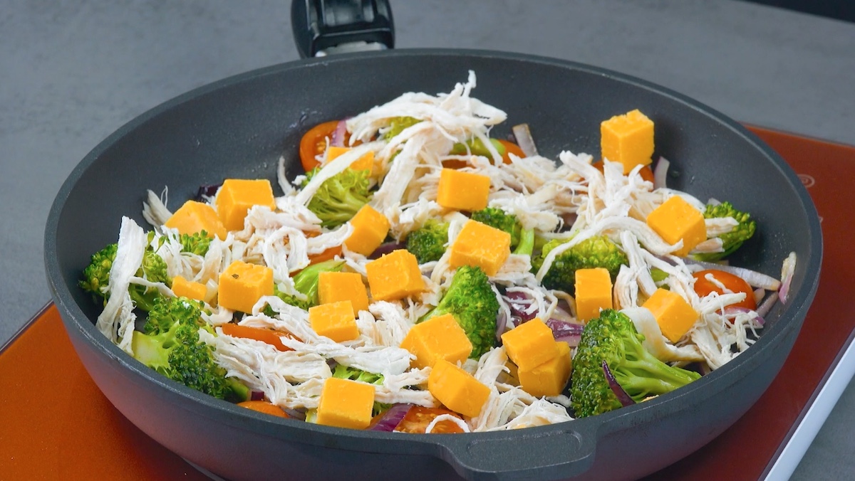 3. Brate nun Zwiebeln und Brokkoli mit etwas Öl in einer Pfanne an und schmecke alles mit Salz und Pfeffer ab. Gib dann die Tomaten hinzu und verrühre alles miteinander. Verteile anschließend das Pulled Chicken sowie den Cheddar über dem Gemüse.