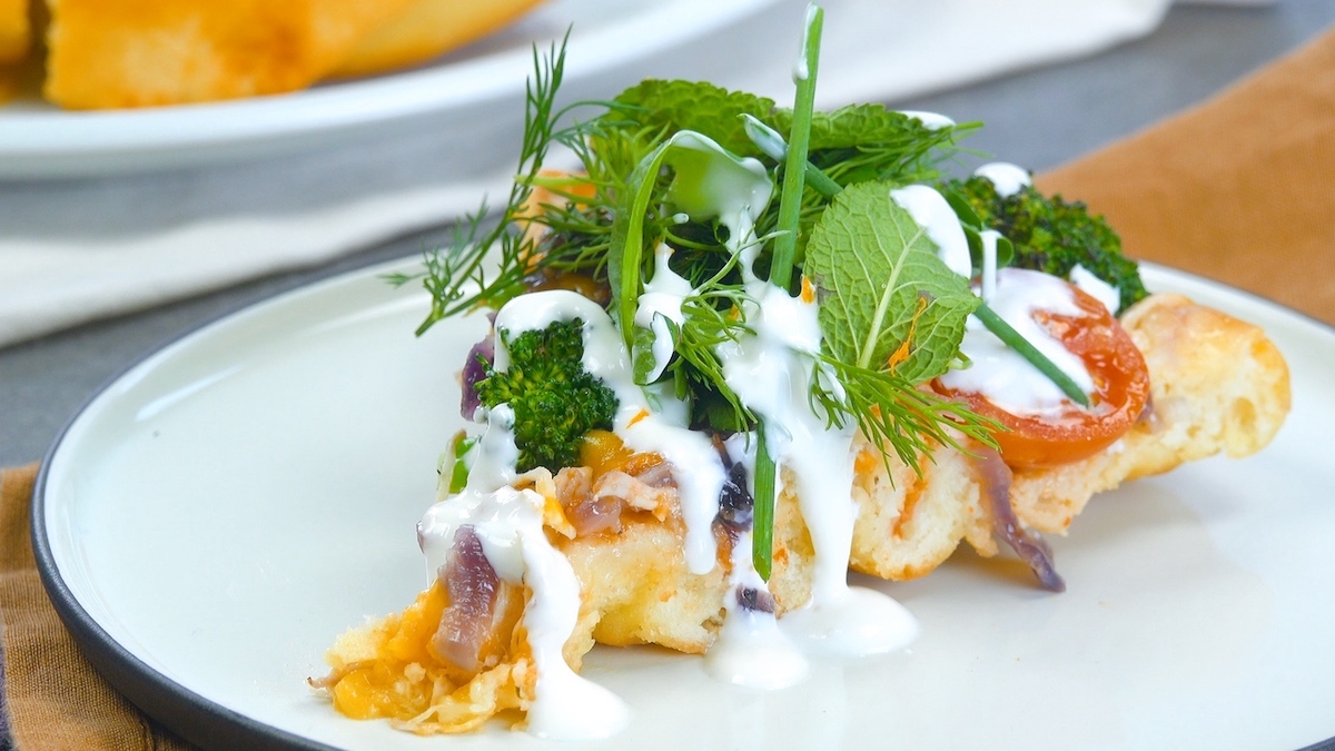 6. Stürze die Pizza nach dem Backen aus der Pfanne und garniere sie vor dem Verzehr noch mit Joghurt und Kräutern.