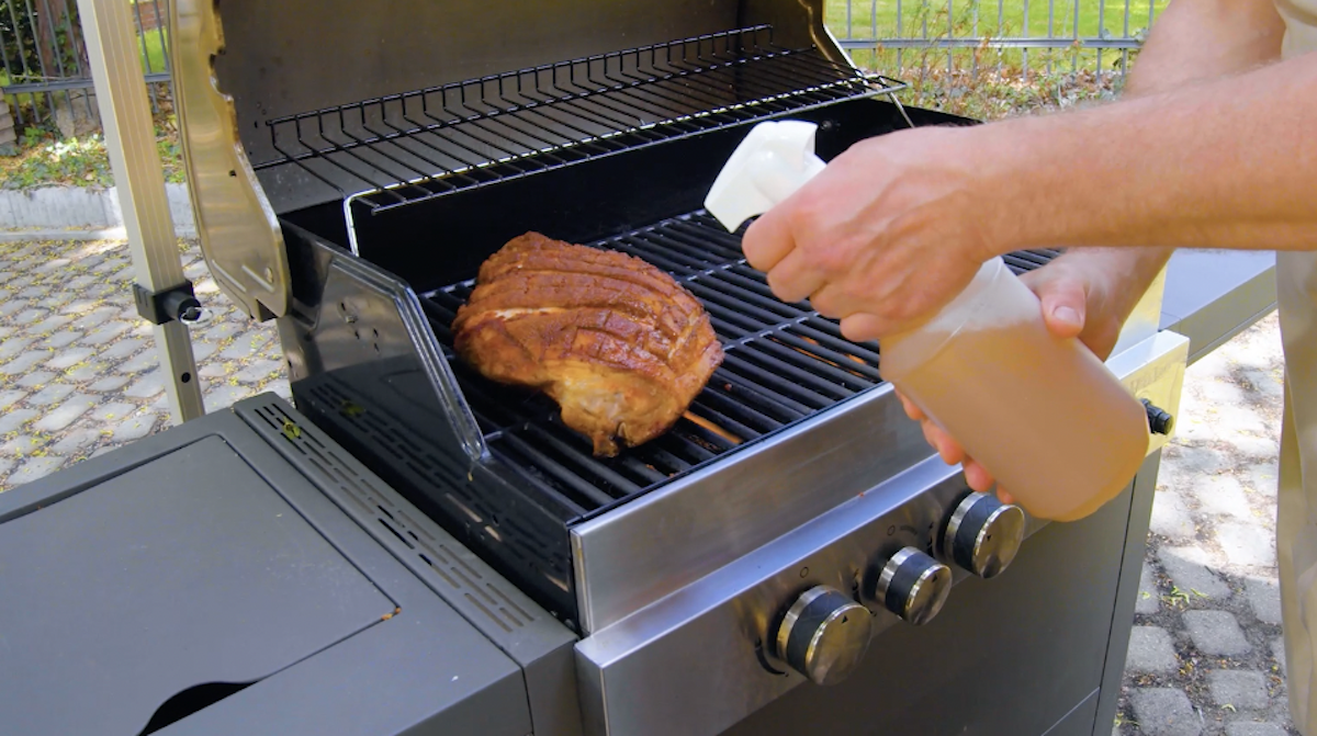 1. Ziehe den Apfelsaft auf eine große Spritze auf und injiziere ihn in das Fleisch. Den restlichen Apfelsaft füllst du in eine Sprühflasche. Schneide die Schwarte der Spanferkelkeule mit einem Skalpell kreuzförmig ein. Vermische alle Zutaten für das Magic Dust miteinander, reibe mit dieser Gewürzmischung die Keule ein und lege diese für eine Stunde (optimal: über Nacht) in den Kühlschrank. Brate die Keule bei starker Hitze an und lasse sie dann bei indirekter Hitze und geschlossenem Grill ca. 3 Stunden lang garen. Besprühe das Fleisch zwischendurch mit dem Apfelsaft.