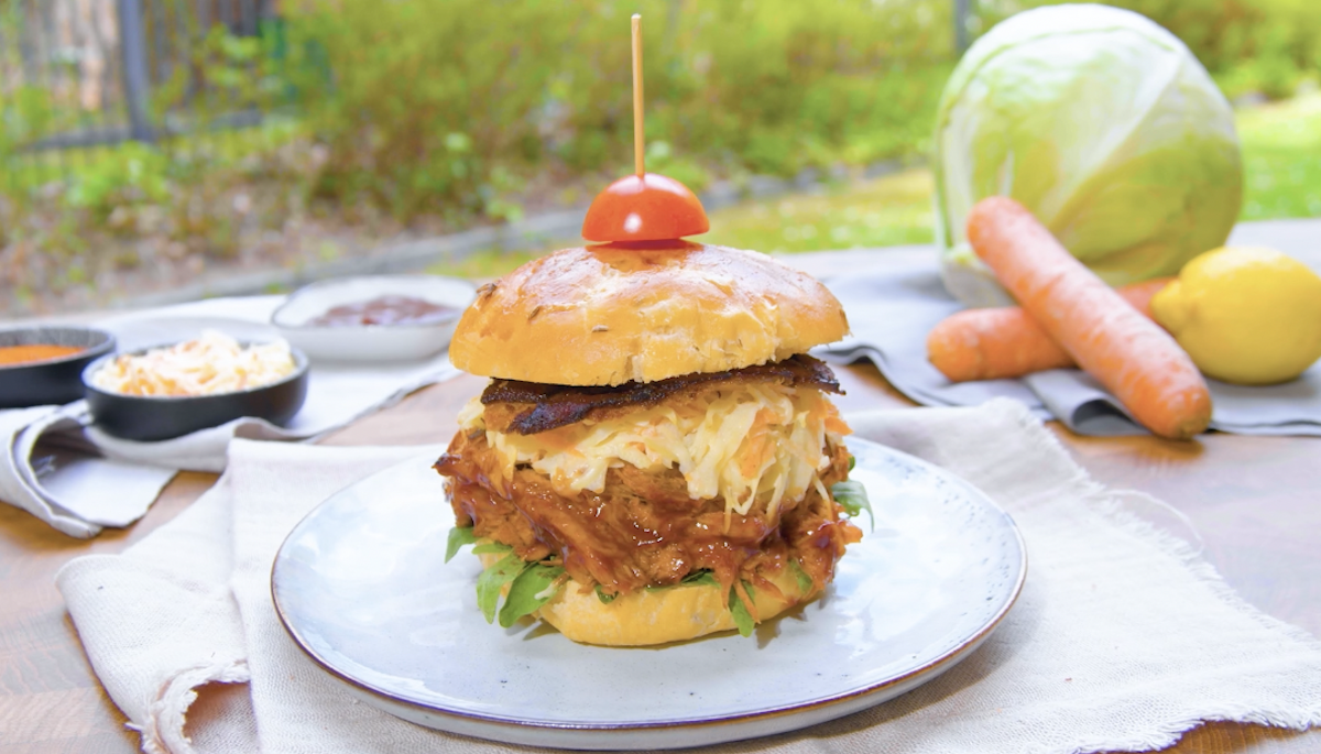 Dieser Pulled-Pork-Burger vom Grill ist durch den Apfelsaft so unglaublich saftig – zusammen mit dem Weißkohl-Bun und dem Coleslaw einfach ein Gedicht. Dieses BBQ wird garantiert keiner so schnell vergessen.