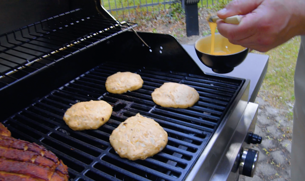 3. Jetzt widmest du dich den Weißkohl-Buns. Lege die andere Hälfte des Weißkohls für etwa 30 Minuten auf den Grill und hacke ihn danach klein. Gib außerdem Butter in eine Pfanne und brate darin die Zwiebeln glasig an. Gib Kümmel, Paprika und 100 ml Wasser hinzu und lasse alles abkühlen. Löse nun in diesem Gewürzwasser Hefe auf. Füge Mehl, Ahornsirup, Salz, den kleingehackten Weißkohl vom Grill sowie Sahne hinzu.