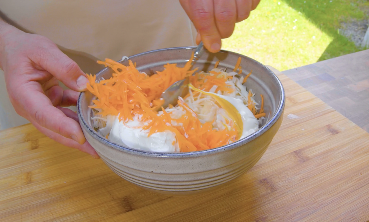 2. Halbiere den Weißkohl und schneide den Strunk heraus. Rasple eine Hälfte des Kohls mithilfe eines Sparschälers in feine Streifen und gib diese in eine Schüssel. Gib Salz hinzu und verknete alles ca. 5 Minuten mit deinen Händen. Füge außerdem geraspelte Möhre, Frischkäse, Senf, Mayonnaise, braunen Zucker, Zitronensaft und Weißweinessig hinzu und vermenge alles miteinander. Schmecke nochmal mit Salz und Pfeffer ab.