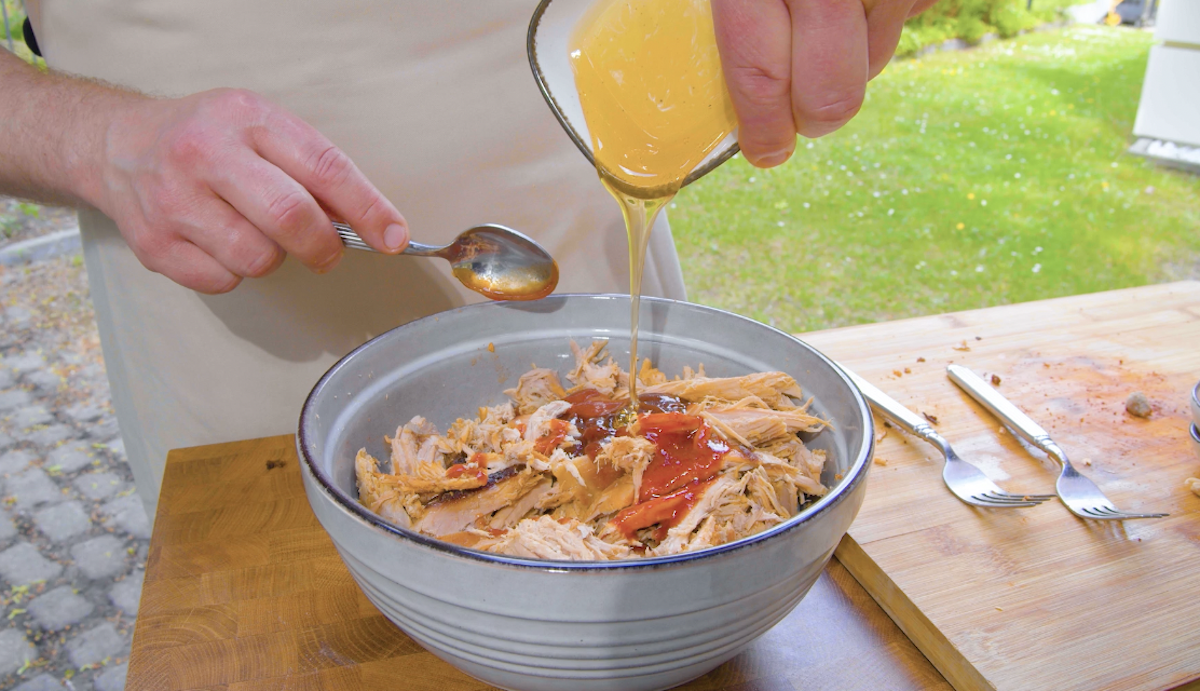 5. Entferne von der gegarten Spanferkelkeule die Schwarte und lege diese gegebenenfalls zum Nachrösten auf den Grill. Ziehe das Fleisch vom Knochen und gib es in eine Schüssel. Zerteile es mit einer Gabel in „Fetzen“, damit es wie typisches Pulled Pork aussieht. Gib dann BBQ-Sauce, Honig und scharfe Sauce hinzu und vermenge alles miteinander.