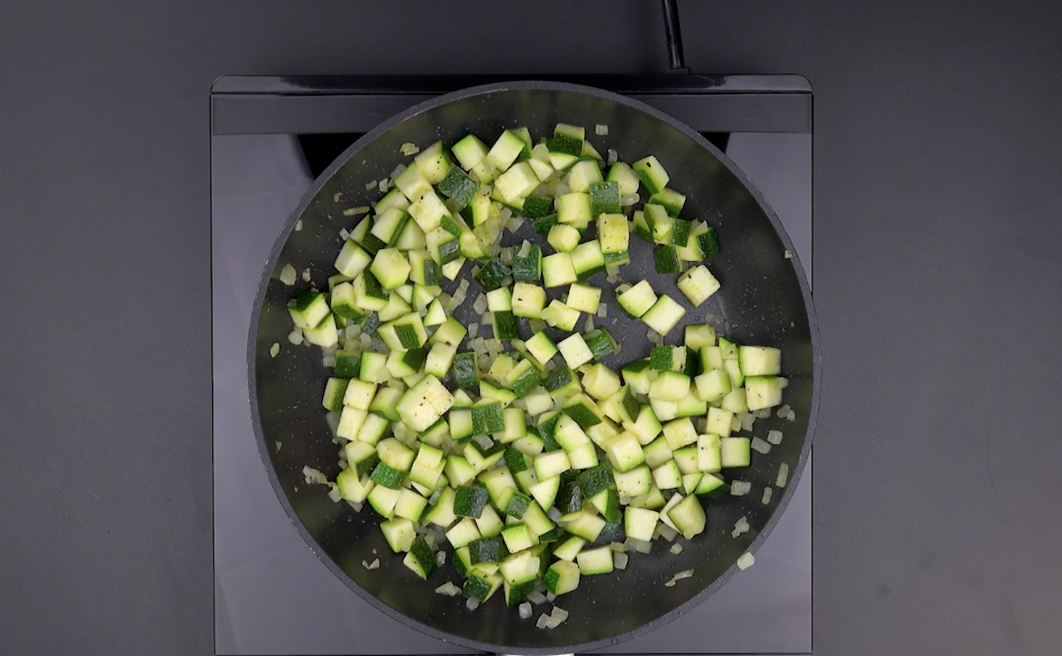 1.) Für die Füllung schneidest du zunächst die Zucchini in mundgerechte oder je nach Belieben in noch kleinere Stücke. Du solltest dir schon bei diesem Schritt überlegen, ob und wie du den Kuchen nach dem Backen mit Zucchinistückchen dekorieren möchtest. In diesem Fall kannst du gleich ein paar Stücke oder Scheiben auf die Seite legen. Dann gibst du etwas Öl in eine Pfanne und lässt es bei mittlerer Hitze heiß werden. Du brätst nun die klein geschnittene Zwiebel darin an und gibst anschließend die Zucchini hinzu. Das Ganze wird noch ein paar Minuten weitergebraten, bis die Zucchini gar sind. Dann würzt du mit Salz und Pfeffer.