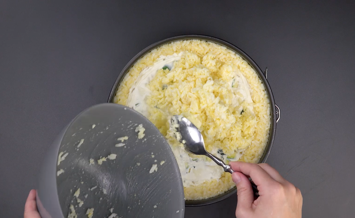 2.) Nun geht es mit der Reismischung weiter: Du vermengst zunächst den gekochten und etwas erkalteten Reis mit den verquirlten Eiern. Anschließend vermischst du dies mit dem Parmesan und zum Schluss alles mit einer Prise Muskatnuss. Etwa 3/4 der Mischung gibst du nun in eine gefettete runde Springform. In der Mitte solltest du, am besten mithilfe eines Löffels, eine gleichmäßige Mulde für die Füllung formen. Diese kann ruhig etwas tiefer sein und außerdem sollte um die Mulde herum ein Rand von etwa 2 cm verbleiben.