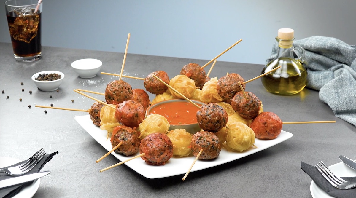 6.) Hackbällchen und Spaghetti am Stiel Eine klassische Kombination, die eigentlich nie enttäuscht, sind Spaghetti mit Hackfleisch. Aber auf die folgende Art und Weise hast du sie bestimmt noch nie gegessen. Dieses Rezept zeigt dir, wie genial man Hackbällchen mit Käse und Spaghetti, frittiert in Tempura-Teig, zubereiten kann. Ein köstlicher „Fingersnack“, der blendend auf ein Partybuffet oder zu einem TV-Abend mit Freunden passt.