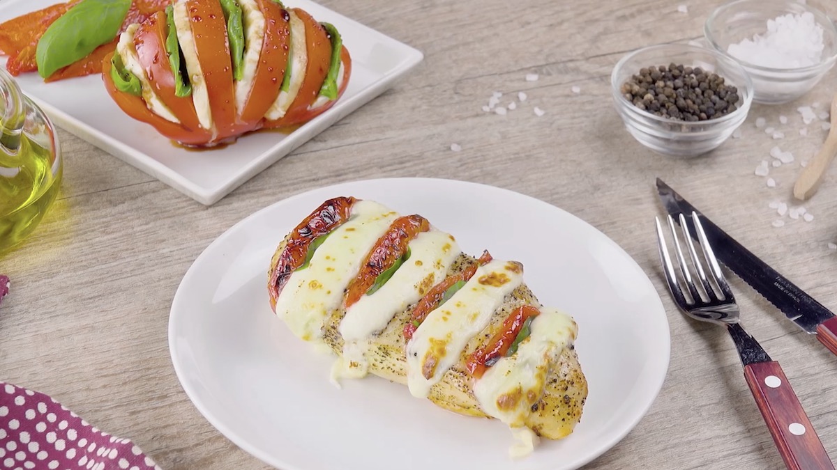 7.) Hähnchen Caprese Als leichte Vorspeise, als Evergreen aller Partybuffets und als italienischer Importschlager ist Caprese-Salat so gern gesehen wie Omas Geldgeschenke. Nicht nur farblich harmonieren Tomate, Mozzarella und Basilikum perfekt, der flotte Dreier scheint auch geschmacklich eine vom Schicksal vorbestimmte Kombination zu sein. Dennoch wagen wir es und erweitern die „Heiligen Drei“ um eine Geflügelzulage.
