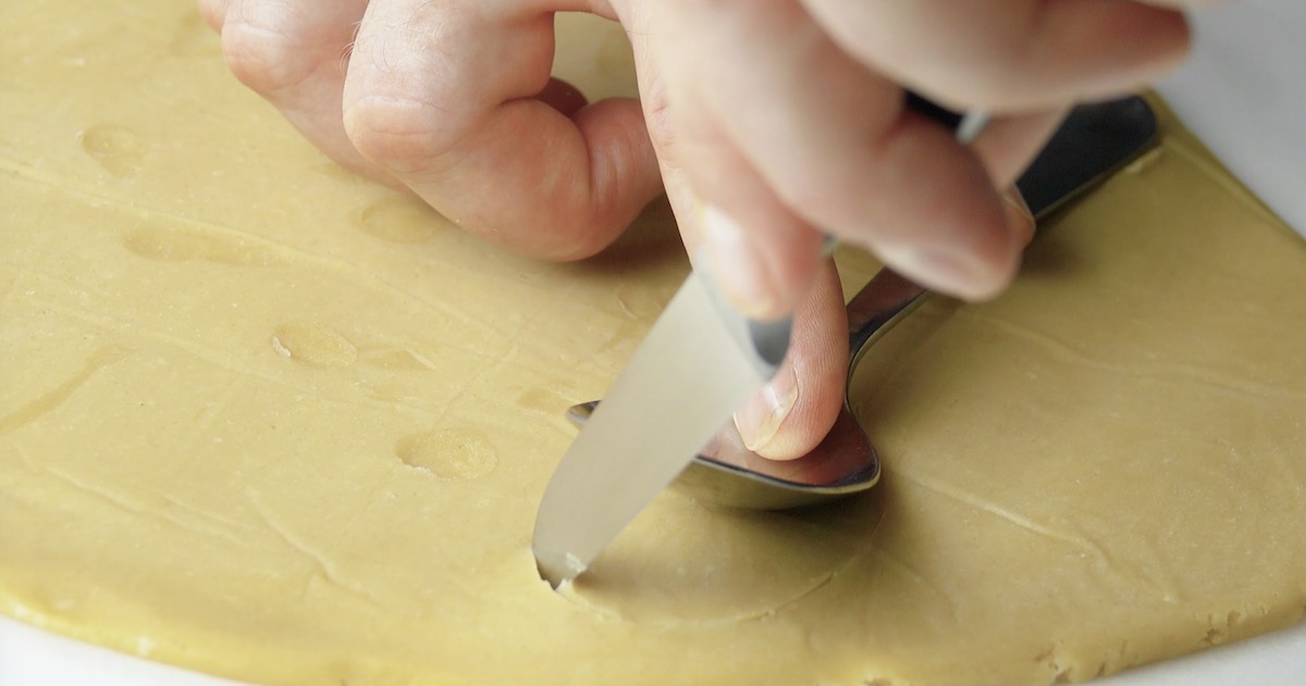 1.1) Stelle den Keksteig her und rolle ihn gleichmäßig aus. Lege einen Löffel auf den Teig und schneide dessen Umrisse mit einem Messer aus. Wiederhole diesen Vorgang auch mit dem restlichen Teig.