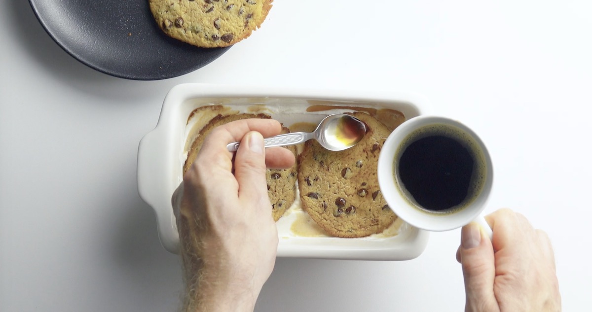 2.1) Stelle den Keksteig her. Forme Cookies daraus und backe sie für 10 Minuten bei 180 °C Ober-/Unterhitze. Lasse die Kekse dann abkühlen. Lege zwei Cookies nebeneinander in eine kleine Auflaufform und übergieße sie mit etwa 1/3 des Kaffees.