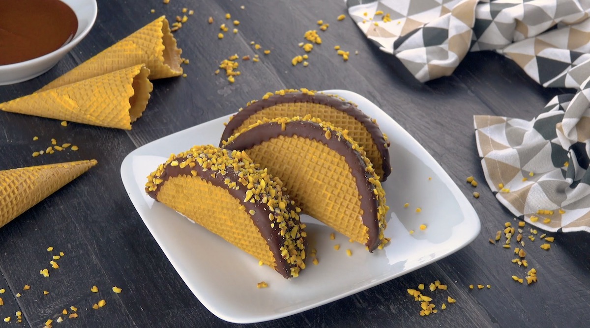 Ja, bei Leckerschmecker hat man einen an der Waffel. Besser gesagt: Man hat drei an der Waffel: nämlich Eis, Schokolade und Haselnüsse. Worum es sich hierbei handelt, ist nichts anderes als ein handlicher Taco der süßen Art. Will da nicht jeder einen an der Waffel haben?