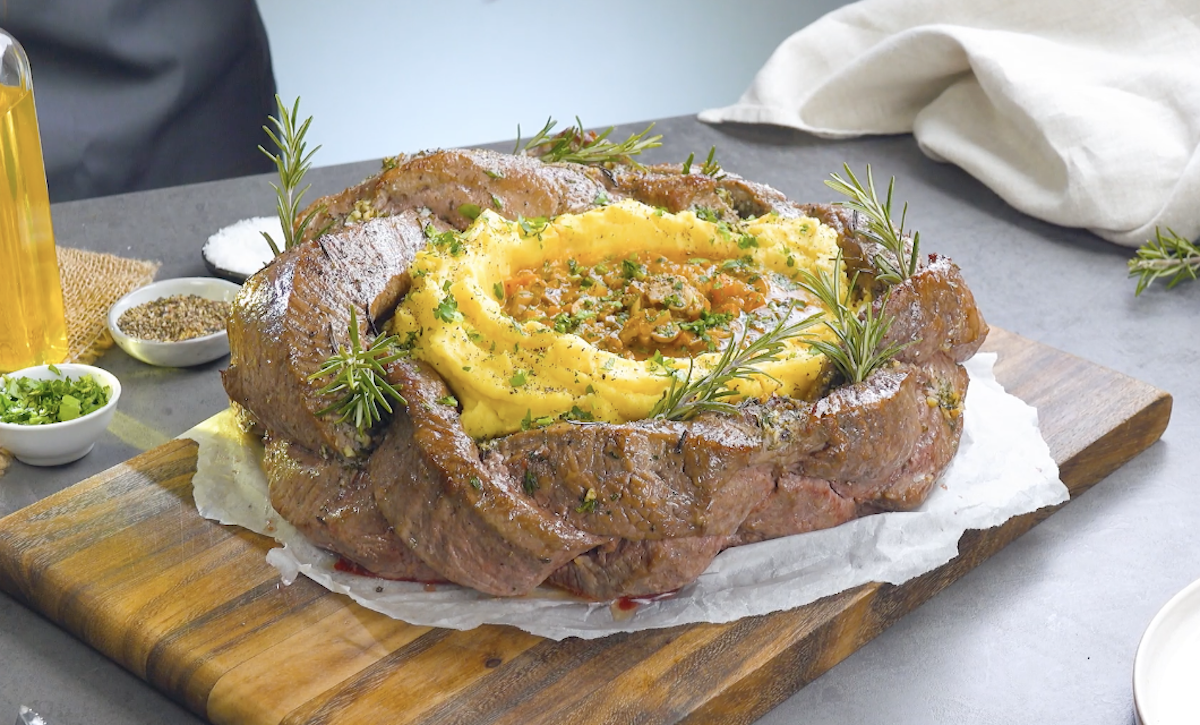 Dieses Rezept ist ein klassisches „Das-Auge-isst-mit-Rezept“. Wir servieren saftiges Rindfleisch mit sämigem Kartoffelbrei und einer würzigen Gemüsesoße als geflochtenen Zopf. Verfeinert wird diese Leckerei mit selbstgemachter Kräuterbutter. Ein köstliches Fleischgericht, das das Abendessen zum absoluten Happening macht.